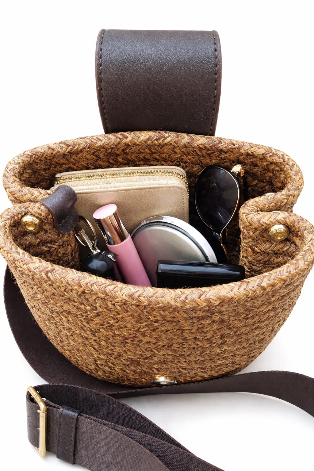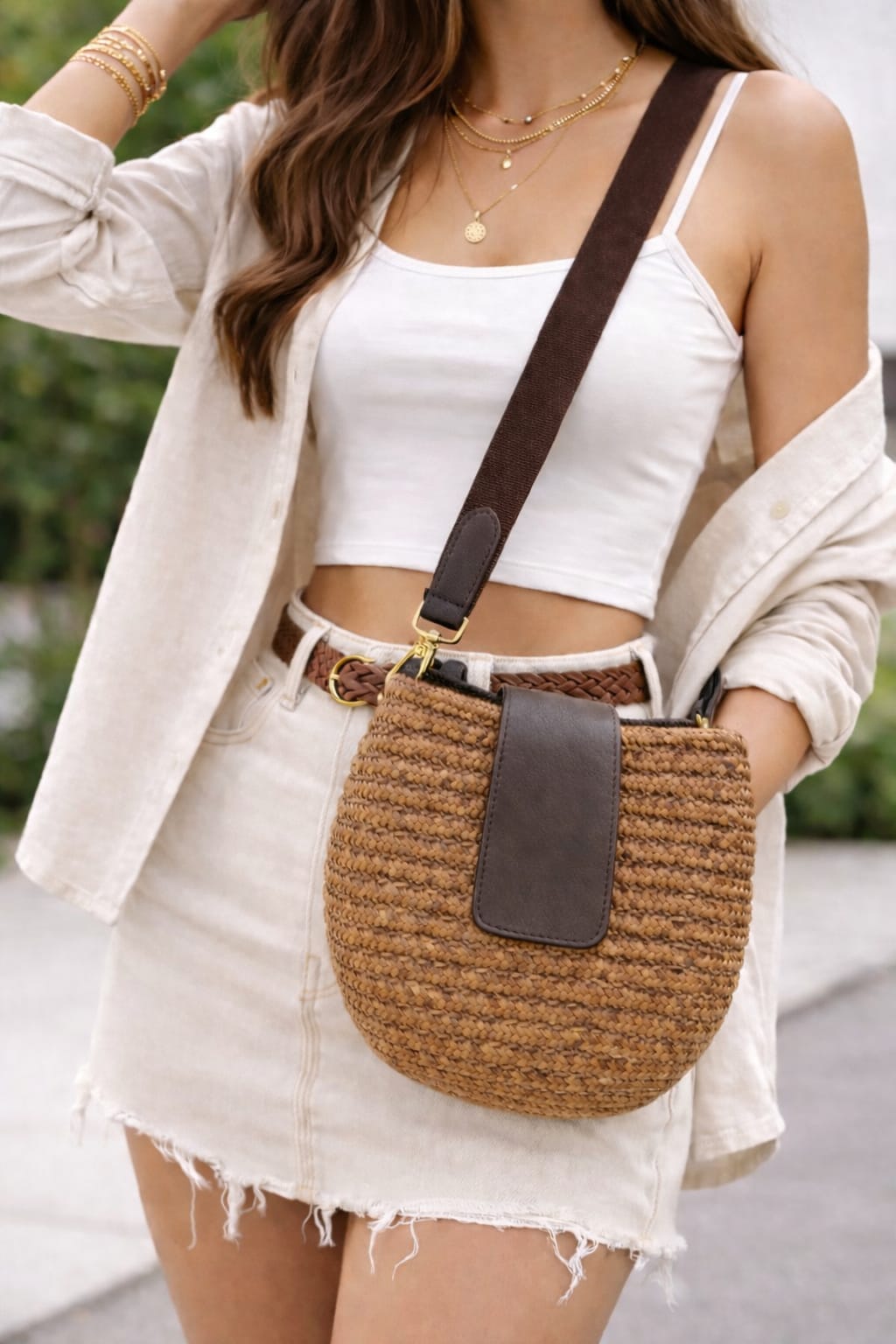 Hasır görünümlü örgü dokusu ve kahve tonlarındaki deri detaylarıyla bu çanta,yözellikle yaz kombinlerinin vazgeçilmez parçası olmaya aday.Hafif yapısı sayesinde gün boyu konfor sunarken,ayarlanabilir askısı ile omuzda veya çapraz kullanım imkanı sağlar.Günlük ihtiyaçlarınızı rahatlıkla taşıyabileceğiniz ideal boyutu,hem şehir hayatınad hemde tatil kombinlerinde şıklığınızı tamamlar.