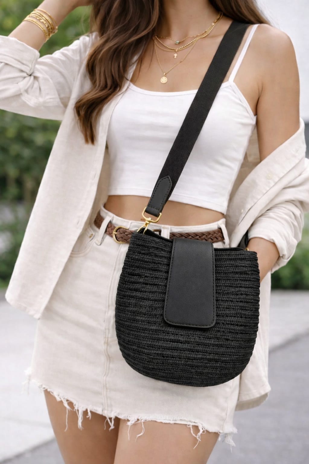 Hasır görünümlü örgü dokusu ve deri detaylarıyla bu çanta özellikle yaz kombinlerinin vazgeçilmez parçası olmaya aday.Hafif yapısı sayesinde gün boyu konfor sunarken,ayarlanabilir askısı ile omuzda veya çapraz kullanım imkanı sağlar.Günlük ihtiyaçlarınızı rahatlıkla taşıyabileceğiniz ideal boyutu,hem şehir hayatında hemde tatil kombinlerinde şıklığınızı tamamlar.